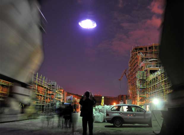 «… Realizado en colaboración con Dominic Harris, de Cinimod Studio, un arquitecto especializado en arquitectura interactiva, Untitled (UFO) es un disco luminoso que, con sus 600 kilos de peso repartidos en una superficie de 15 metros cuadrados y un generador de seis kilovatios, llega a elevarse 500 metros…»
