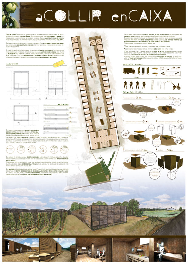 «Acollir en caixa» , proyecto ganador del premio CasaDecor, realizado por el equipo “TresTrastos” de Judit Bustos, Júlia Garcia i Mercè Grané nace como una alternativa a las soluciones existentes de alojamiento de temporeros recolectores de fruta en Girona. Busca proporcionar una estancia amable y humana a los trabajadores y a la vez integrarse en el espacio y la zona. Encaja mimetizándose con el paisaje ya que pasa desapercibido en la imagen habitual de los campos Empordaneses, lo que enfatiza la vida rural.