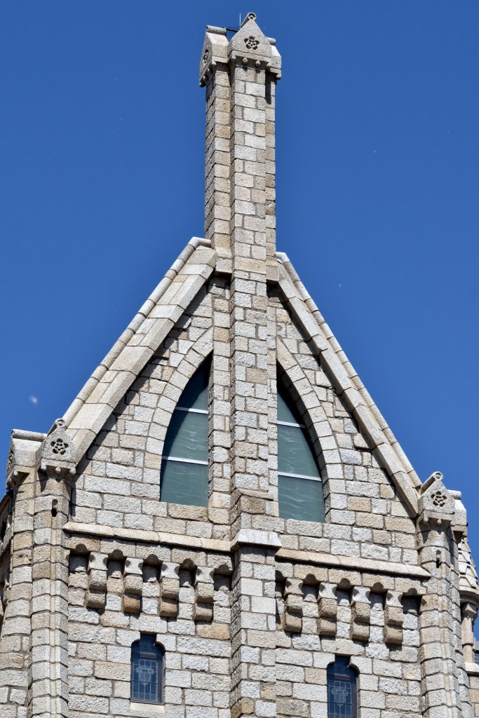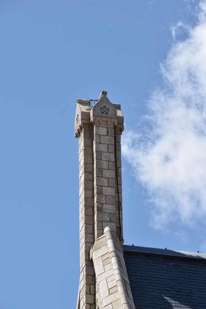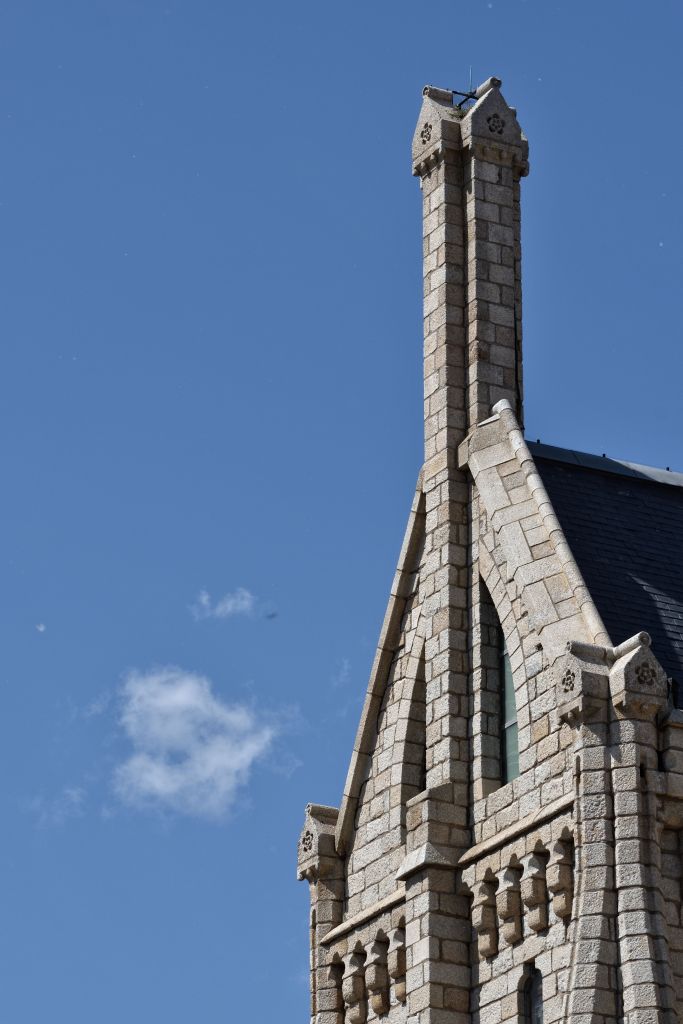 Consta de cuatro fachadas flanqueadas por cuatro torreones. La principal y trasera, con sus ventanales apuntados, confieren al edificio un carácter de templo gótico.