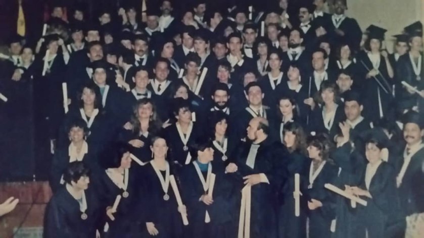 En la imagen: flamantes arquitectos junto a su padrino de promoción en el Aula Magna UCV (1987)