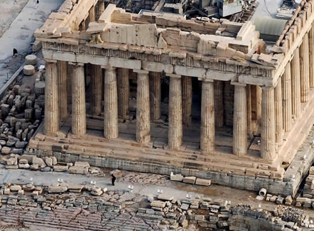 Y la parte norte del templo del Partenón se puede ver ahora limpia de andamios y sin las grapas de hierro oxidadas que se habían colocado a principios del siglo pasado. Su destrucción se debió a la tremenda explosión ocurrida en 1687, cuando los turcos defendían la ciudad del ataque de sus enemigos los venecianos, y habían colocado su polvorín dentro de este templo. Las flechas incendiarias de la tropa, bajo el mando del Almirante Morosini, provocaron la explosión y el incendio que destruyó el templo. Ahora la mayor parte de las columnas dañadas se han restaurado, incluyéndose nuevos elementos de mármol provenientes siempre de la misma cantera original, en el Monte Pendéli a las afueras de la capital. Muchos fragmentos han vuelto a ser colocados en sus posiciones correctas y se han sustituido seis metopas esculpidas por fieles copias. Serán expuestas próximamente en el nuevo Museo de la Acrópolis.